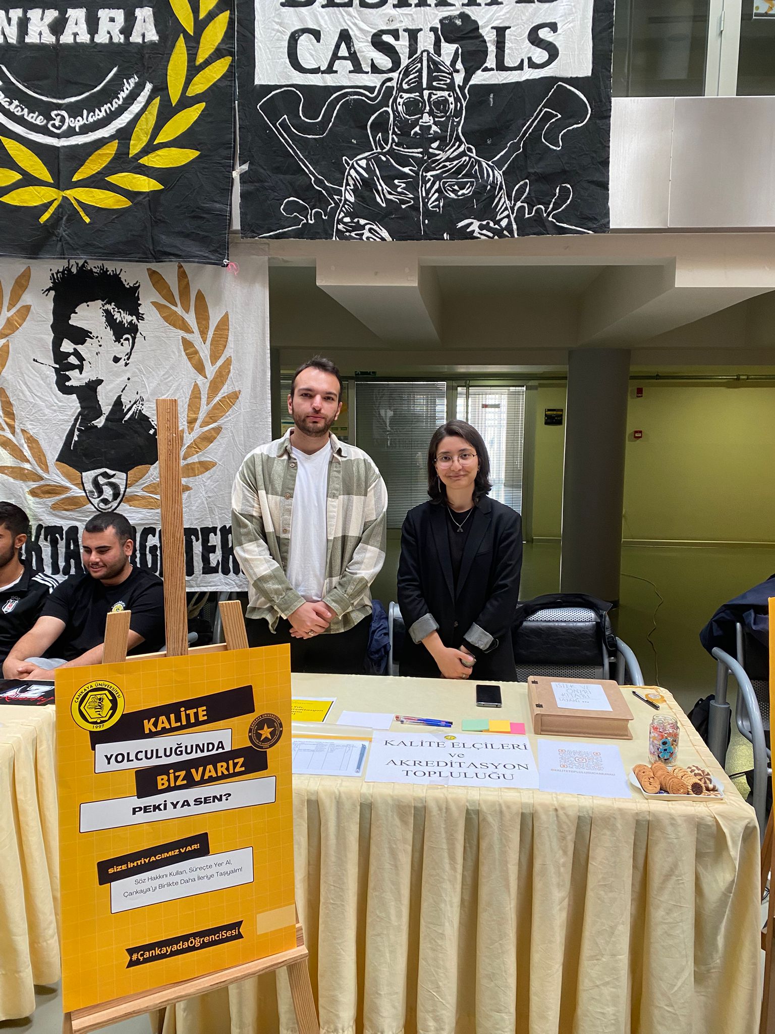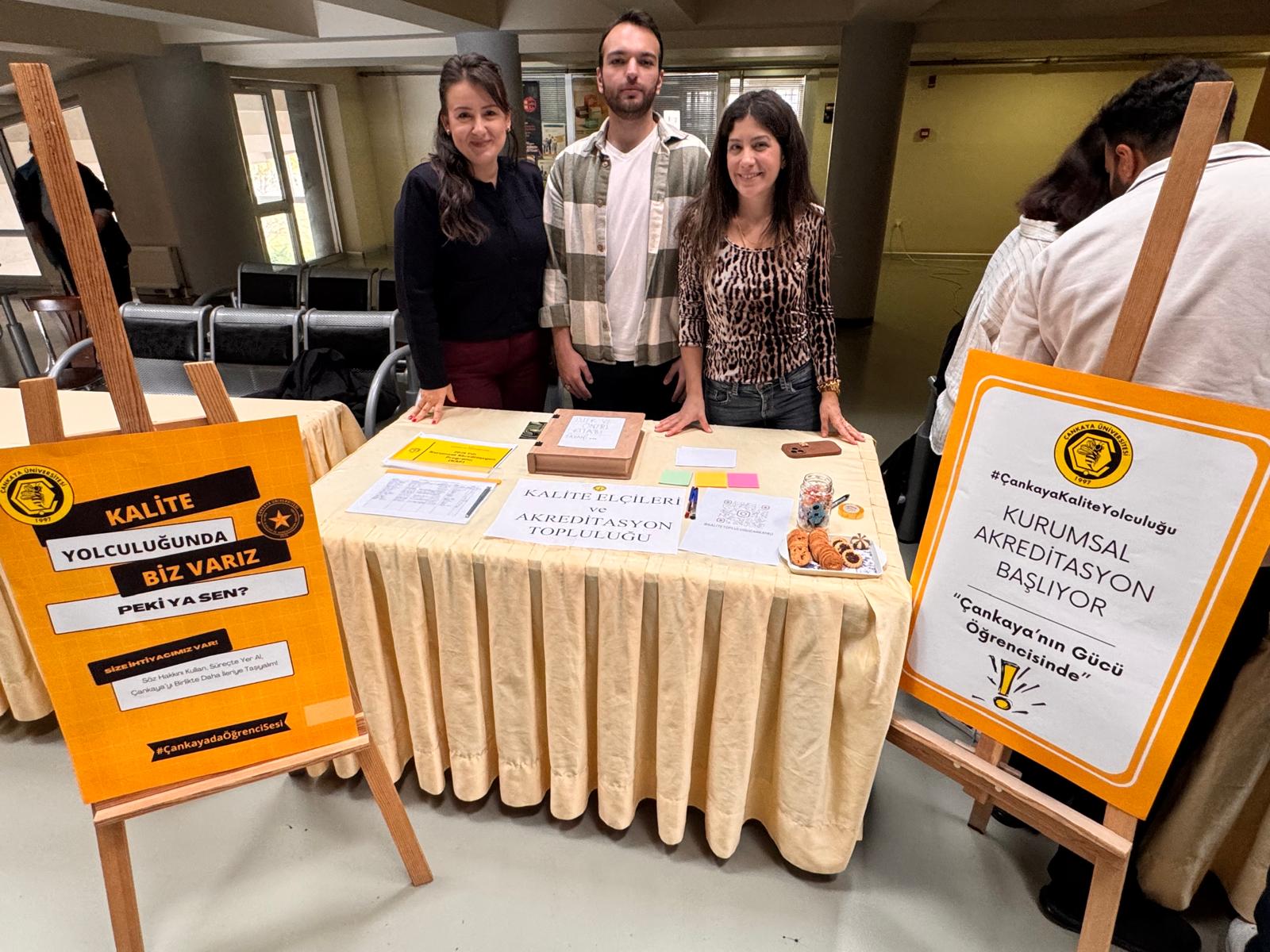 Kurumsal Akreditasyon Programı (KAP) kapsamında kalite kültürünün yaygınlaştırılması ve öğrenci katılımının artırılması amacıyla, Kalite Elçileri ve Akreditasyon Topluluğu tarafından çeşitli bilgilendirme faaliyetleri yürütülmüştür. Bu kapsamda, Çankaya Üniversitesi Topluluk Tanıtım Günü etkinliğinde stant açılarak öğrencilere KAP süreci, kalite güvence sistemi ve topluluğun çalışmaları hakkında bilgi verilmiştir. Etkinlik boyunca öğrencilere broşürler dağıtılmış, soruları yanıtlanmış ve kalite süreçlerine aktif katılım konusunda farkındalık oluşturulmuştur. Bu çalışmalar, öğrencilerin kalite süreçlerine olan ilgisini artırmak ve katılımcı bir kalite anlayışı oluşturmak adına önemli bir adım olmuştur.